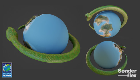 Bantam Planet sought Sonderflex's expertise to craft a 3D planet model that resembles their logo, including distinct elements such as land, clouds, and a circling snake, aligning with their game's thematic vision. Basically creating a 3D and 2D Asset for Bantam Planet Website Integration